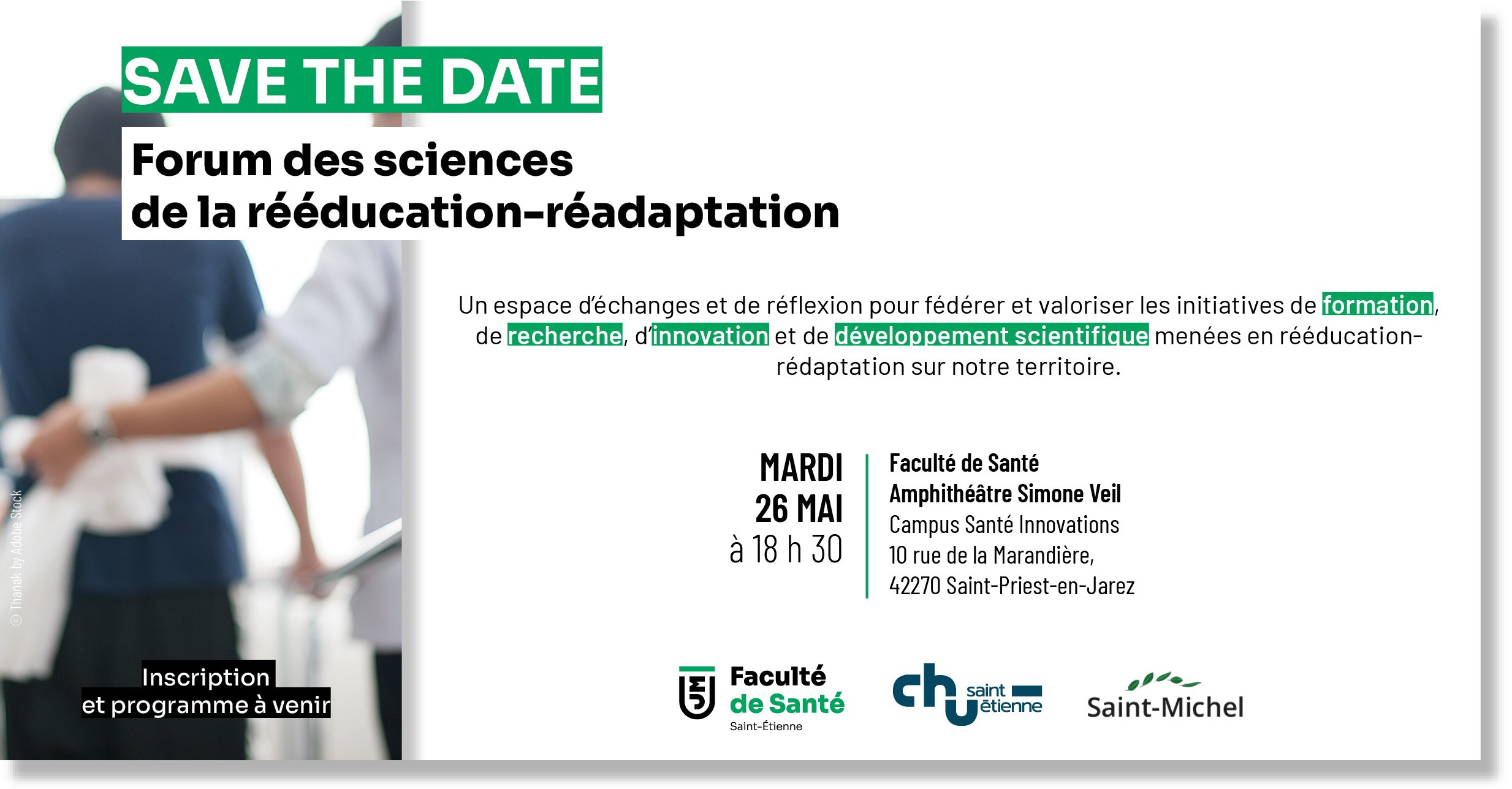 Nous avons le plaisir de vous annoncer la tenue de la seconde édition du Forum des Sciences de la Rééducation-Réadaptation, qui se déroulera le mardi 26 mai 2026 à 18 h 30 à la Faculté de Santé de Saint-Étienne.
